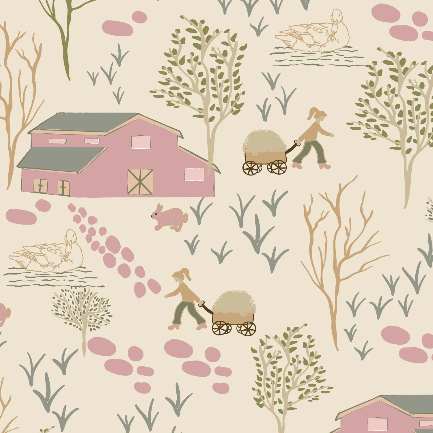 “Sweet Prairie” is a nostalgic collection that celebrates the timeless beauty of farm life. Inspired by my childhood summers at my grandfather’s ranch in Chino California. the designs weave together barns, blossoms, bees, and bunnies to tell a story of heritage and harmony. Soft, comforting hues evoke the warmth of sunny days baling hay, feeding the horses, and resting under the shade of walnut trees. This collection brings the heart of the countryside into the everyday living.